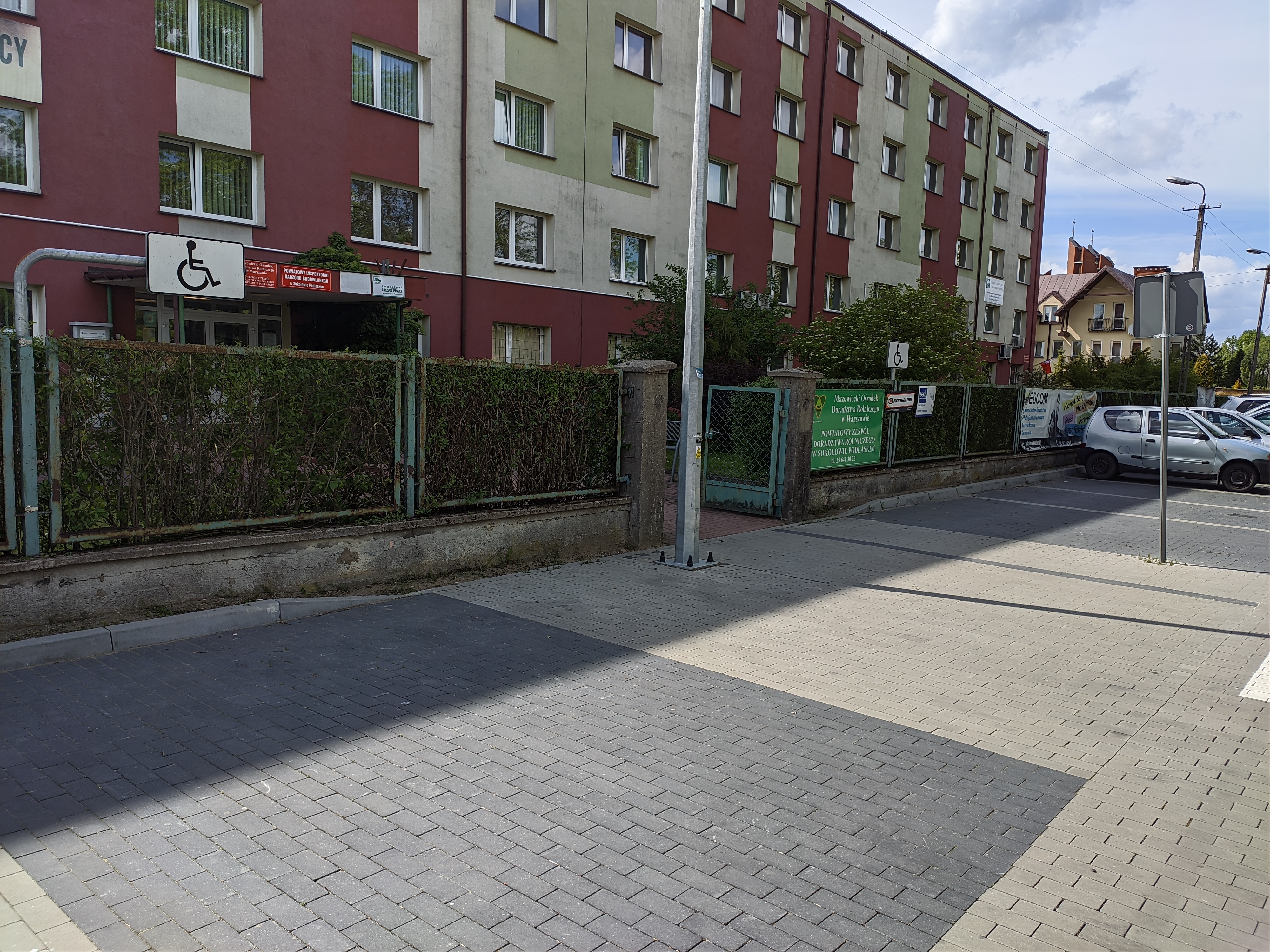 Przed budynkiem są specjalne dwa miejsca parkingowe dla osób z niepełnosprawnościami.